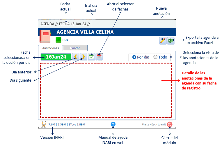 Aqui se pueden revisar todas las anotaciones registradas en la agenda navegando por dia o viendo todas las anotaciones juntas
