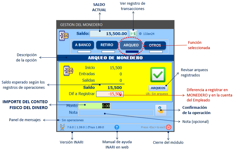 Registro del arqueo del MONEDERO donde ajustan y alinean los registros entre INARI y el dinero fisico contado