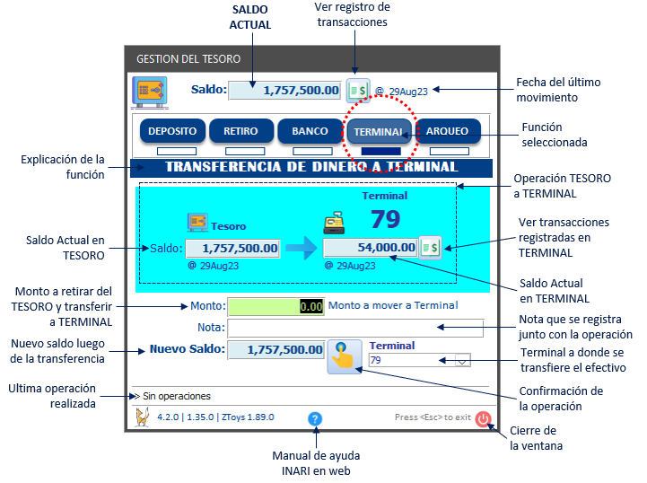 Registro de transferencia de efectivo desde el TESORO a la CAJA de la terminal seleccionada